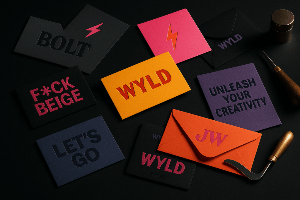 Deep deboss with gold foil for a warm, sophisticated identity.